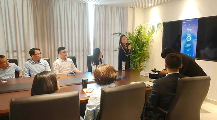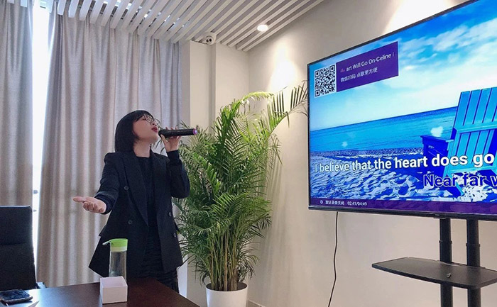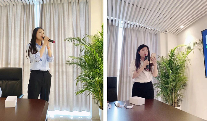 伴隨著現(xiàn)場(chǎng)緩緩奏起的輕音樂,主持人Sandy在進(jìn)行自我介紹和現(xiàn)場(chǎng)預(yù)熱后,以抽簽形式開始了歌曲競(jìng)唱環(huán)節(jié),國(guó)際市場(chǎng)部的Sabrina自告奮勇獻(xiàn)唱曲,熱情演唱了經(jīng)典英文歌曲——《 Trouble is a friend 》,贏得現(xiàn)場(chǎng)陣陣掌聲!