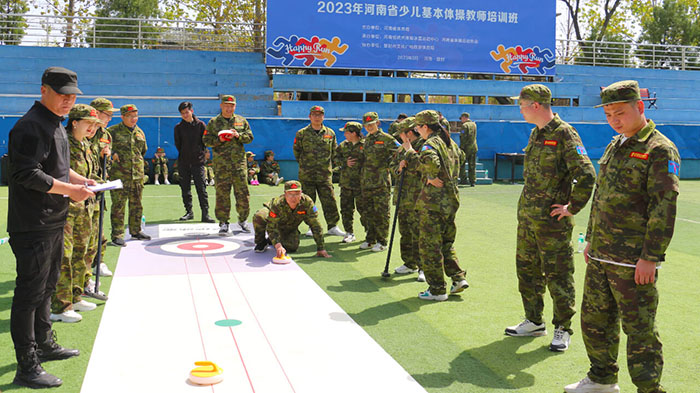 在【旱地冰壺】項目中,八個小組的隊員們一邊商榷對敵戰術,一邊進行任務分配。隨著一聲哨響,兩個賽隊同時開賽。隊員們全神貫注、凝神靜氣,向前邁步沖刺,揮動手臂擲壺,冰壺按照隊員們設想的路線擊打到對方的冰壺,使其滑出得分圈并穩穩地停留在中心點,成功得分,大家歡呼雀躍,圍觀隊員們也紛紛叫好,掌聲、歡呼聲此起彼伏,好不熱鬧。